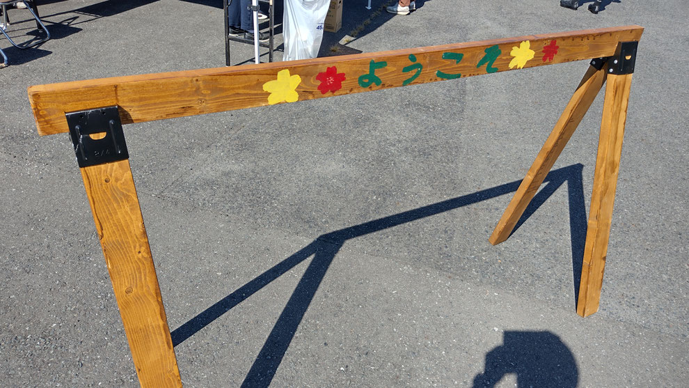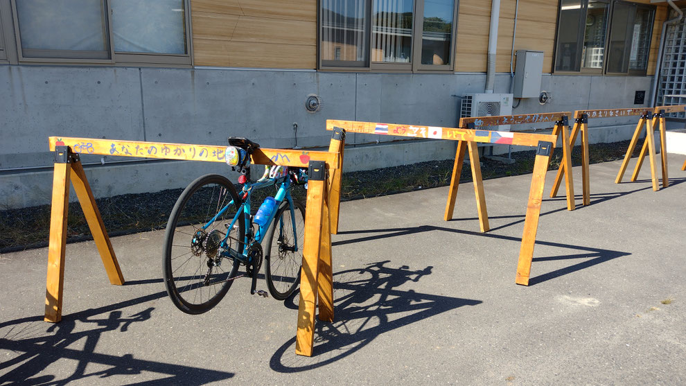 手作りのサイクルラックがお出迎え。